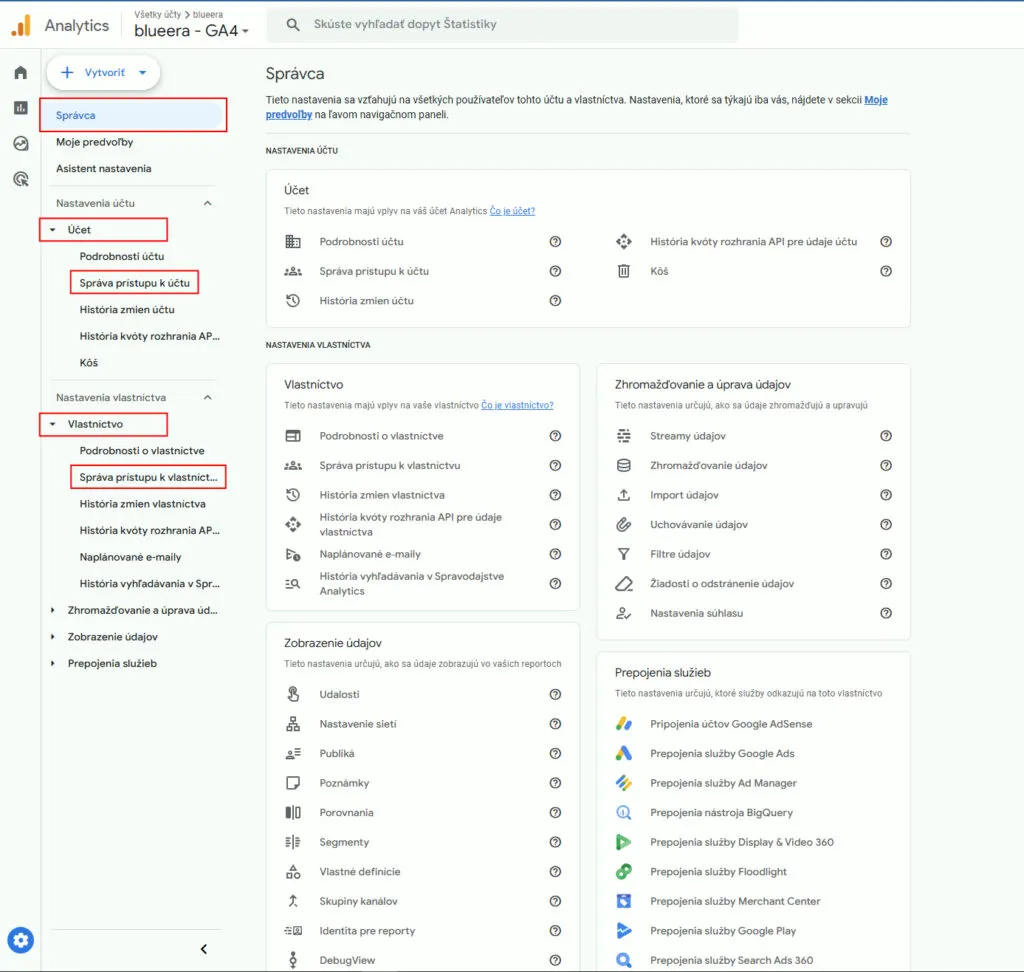 3. Ak máte viac účtov, v ľavom hornom rohu si vyberte správny účet a vlastníctvo (property), ku ktorému chcete prístup udeliť.