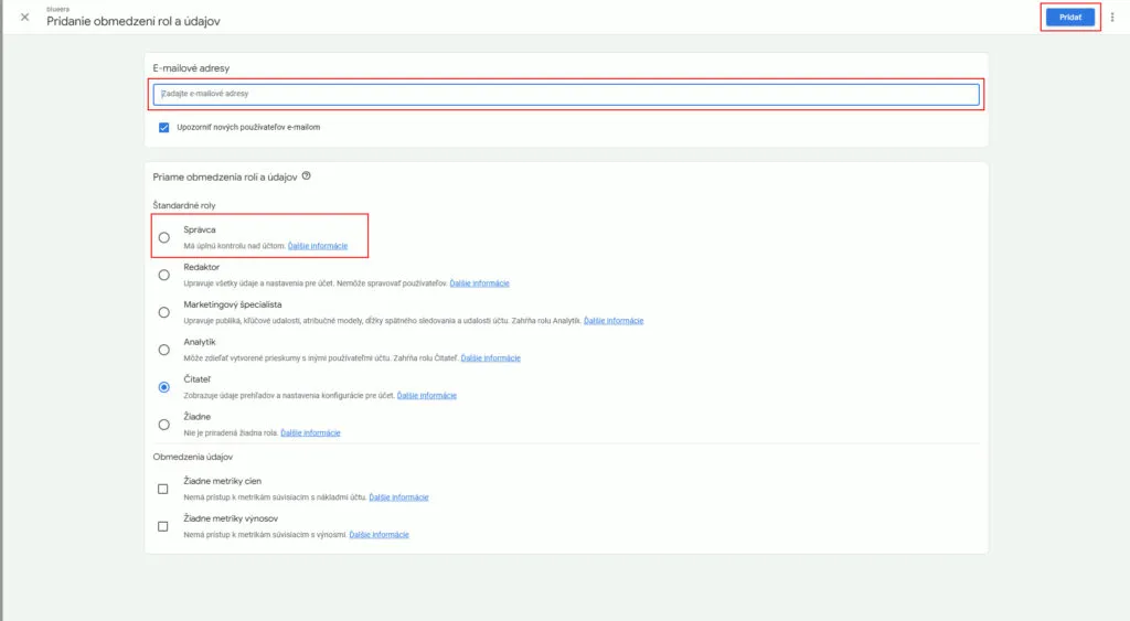 Udelenie prístupu len na úrovni konkrétneho vlastníctva (Property Access Management), aby používateľ nemal prístup aj k ostatným GA4 projektom.