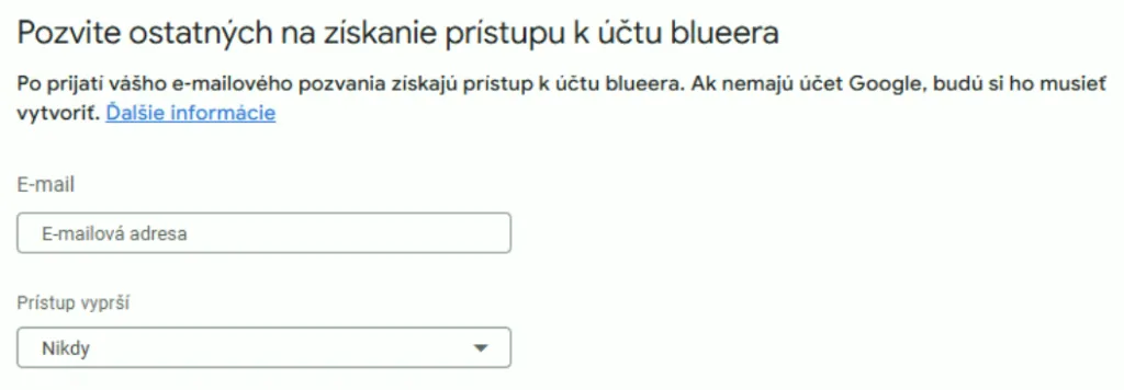 Pozvaná osoba/agentúra dostane e-mail s pozvánkou. Musí kliknúť na odkaz v e-maile a prihlásiť sa svojim Google účtom. Po prijatí sa jej prístup aktivuje a bude to viditeľné v zozname používateľov v časti “Prístup a zabezpečenie”.